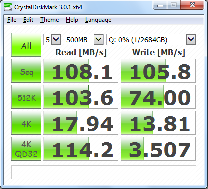 First, I ran a few quick tests using CrystalDiskMark. This benchmark tool measures the performance of a storage device by testing its sequential read and write speeds as well as its random read and write speeds using blocks 4KB and 512KB in size.