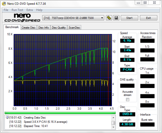 The SE-218BB uses P-CAV, or Partial CAV, when writing to DVD+R and DVD-R media at 8x. By looking at the screenshots above, you can see that Samsung's new drive starts writing at about 3.48x and accelerates, reaching its maximum speed at the 4GB mark.