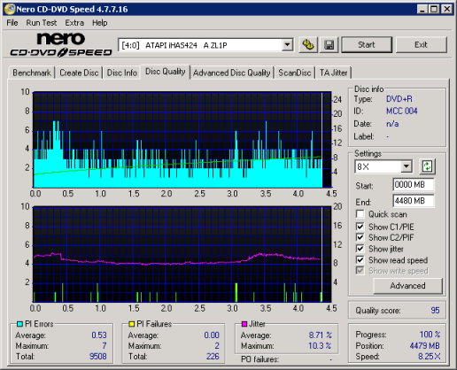 So what about writing quality? Using CD Speed we can test a disc's PI (Parity Inner), PIF (Parity Inner Fail) and Jitter rates. For these tests I used a Lite-On iHAS424 and read the discs at 8x with the PI and PIF ECC sums set to 8 and 1 respectively.