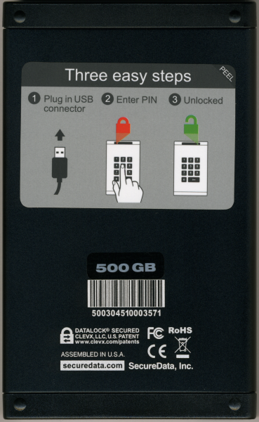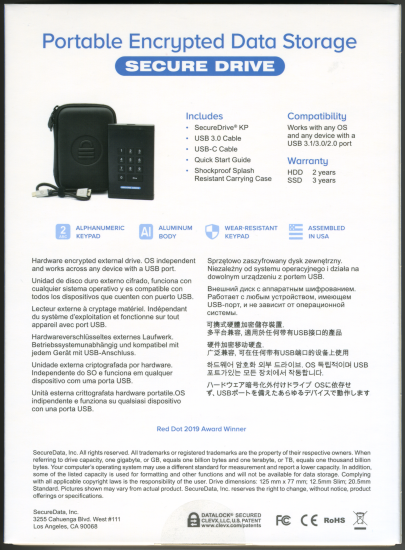 SecureData has updated its packaging since we last looked at one of their portable drives and now, instead of a clear plastic case, the SecureDrive KP comes in white box. In addition to a picture of the drive, the packaging advertises many of its key features including its FIPS compliance, 500GB capacity, alpha numeric keypad, built-in antivirus and USB 3.0 interface. One bit of information that the packaging is lacking though, is whether the drive inside is an SSD or a hard drive. The only way to tell is to look at the model listed on the side of the box.
