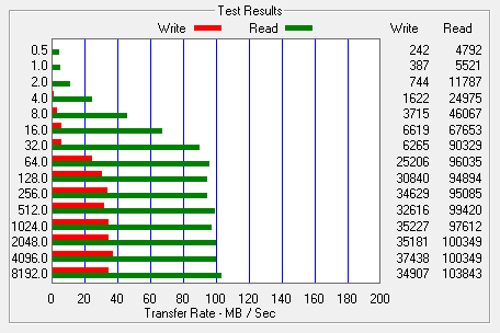 The Supersonic was a little slower than the drive from Super Talent when reading 4kB and 64kB files. Nevertheless, it performed very well when reading larger files, reaching a maximum speed of 104.13 MB/s.