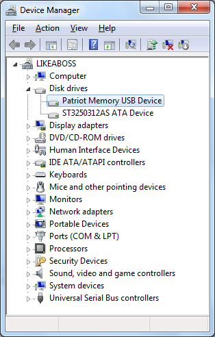 If installed correctly, the Supersonic should show up in the Device Manager. Under Windows 7, the drive is identified as a "Patriot Memory USB Device".