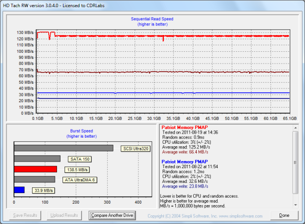 Next, I used HD Tach to test the Supersonic's read, write and burst speeds as well as its seek times and CPU usage.