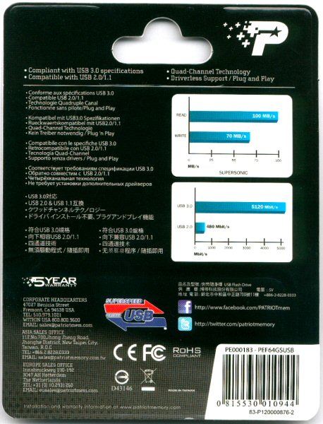 The Supersonic comes packaged in a cardboard blister pack. The front of the card advertises the drive's capacity, rated speeds and key features including its quad-channel technology and USB 3.0 interface. On the back, Patriot has provided a few graphs showing the Supersonic's maximum read and write speeds as well as the difference in performance between USB 3.0 and USB 2.0.