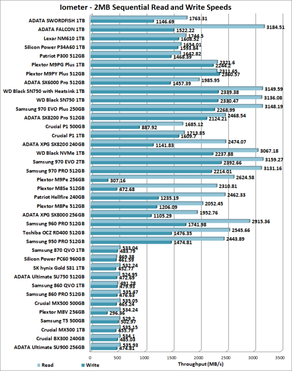 The SWORDFISH's performance here was similar to what we saw in our other tests. The drive was able to read at 1763.31 MB/s and write at 1146.69 MB/s.