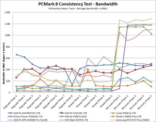 PCMark 8 also includes a consistency test which measures the performance consistency and degradation tendency of a storage system. The test reports the performance level at the start, the degraded steady-state and the recovered state as well as the number of iterations required to reach the degraded state and the recovered state. For this test, we are focusing on the Adobe Photoshop (Heavy) trace and will look at both the bandwidth and latency of the drive