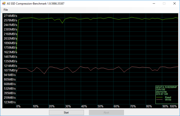 As I mentioned earlier, the XPG SX8200 is based on SMI's SM2262 controller chip. Looking at the screenshot above, you can see that it performs equally well with both incompressible (0%) and compressible (100%) data.