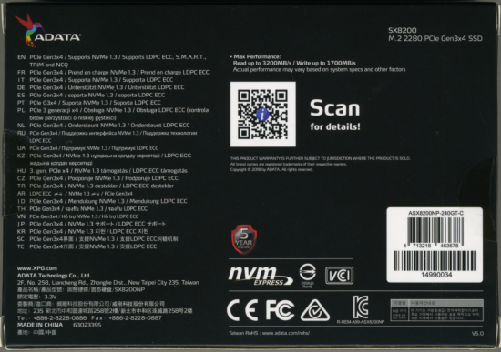 The XPG SX8200 is available in 240GB, 480GB and 960GB capacities. For this review, ADATA sent us the 240GB version of the drive which is capable of delivering up to 3,200 MB/s sequential read and 1,100 MB/s sequential write speeds as well as up to 200,000 random read and 240,000 random write IOPS.