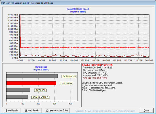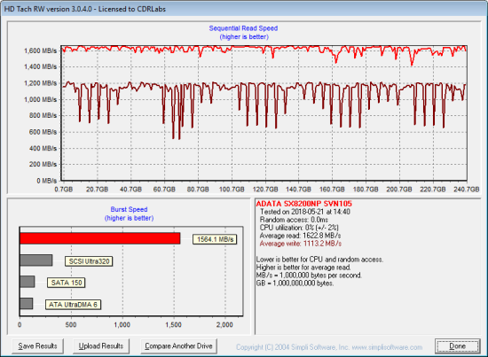 Next, I used HD Tach to test the SX8200's read, write and burst speeds as well as its seek times and CPU usage.