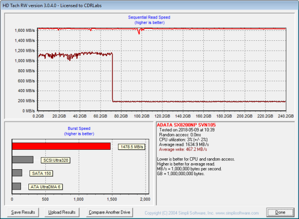 Looking at the screenshot above, you can see that the SX8200 had average read and write speeds of 1634.9 MB/s and 467.2 MB/s respectively, as well as a burst speed of 1478.5 MB/s. The screenshot also shows that, like most other TLC-based SSDs, the SX8200 uses some sort of SLC caching. The drive starts writing at about 1,100 MB/s and then drops to about 200 MB/s when the write operation exceeds the size of the cache.