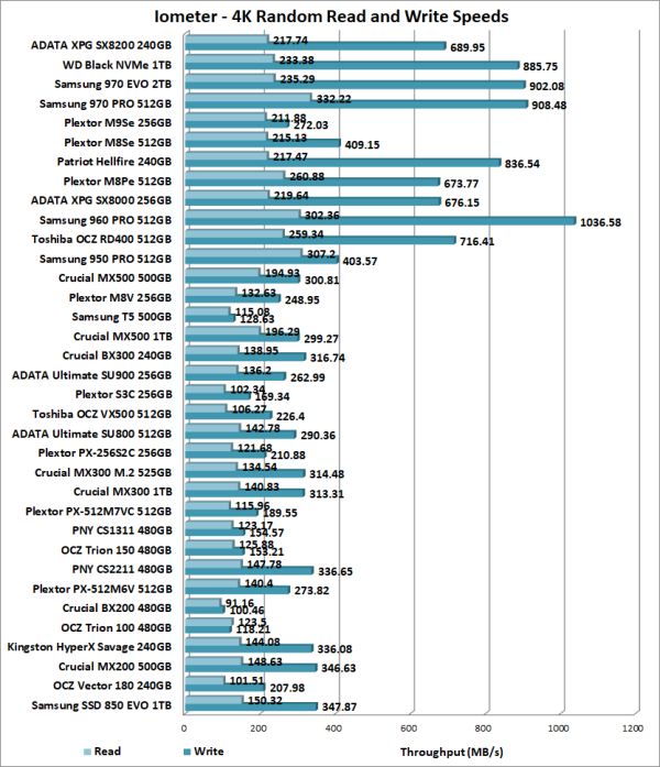 The SX8200 also performed very well when doing random reads and writes. In our tests, the drive was able to read at 217.74 MB/s and write at 689.95 MB/s.