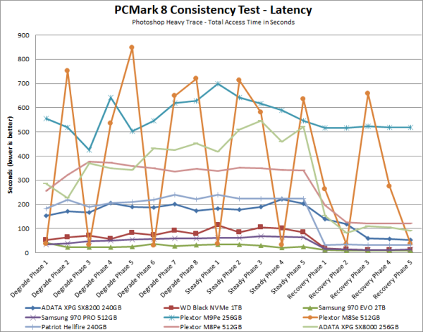 PCMark 8 also includes a consistency test which measures the performance consistency and degradation tendency of a storage system. The test reports the performance level at the start, the degraded steady-state and the recovered state as well as the number of iterations required to reach the degraded state and the recovered state. For this test, we are focusing on the Adobe Photoshop (Heavy) trace and will look at both the bandwidth and latency of the drive