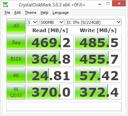 The Radeon R7 performed equally well when using highly compressible 0x00 (0 Fill) data. This time around, the drive was able to read at 469.2 MB/s and write at 485.5 MB/s.
