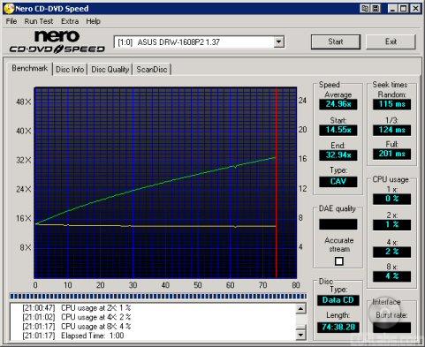 While the DRW-1608P2 can read pressed and CD-R media at 40x, its CD-RW read speeds are limited to only 32x. As you can see, the drive had no problems reaching this speed in our tests.