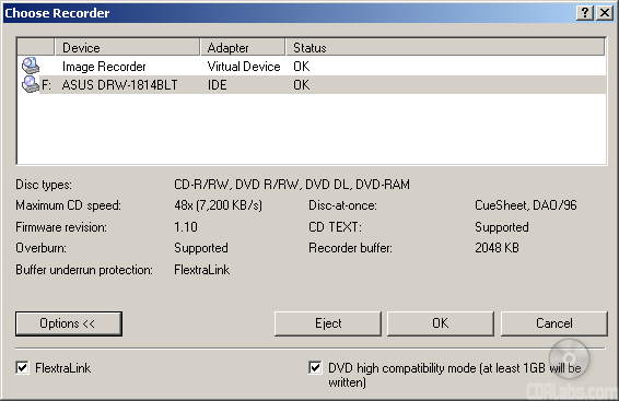 The Nero screenshot also shows that the DRW-1814BLT has a maximum CD writing speed of 48x and a 2000KB buffer. This buffer is also backed up by ASUS's FlextraLink technology. According to Nero, the drive can write CD-Text and overburn. When testing the drive's capacity, it had no problems overburning up to 99 minutes with CompUSA's 99 minute CD-R media.
