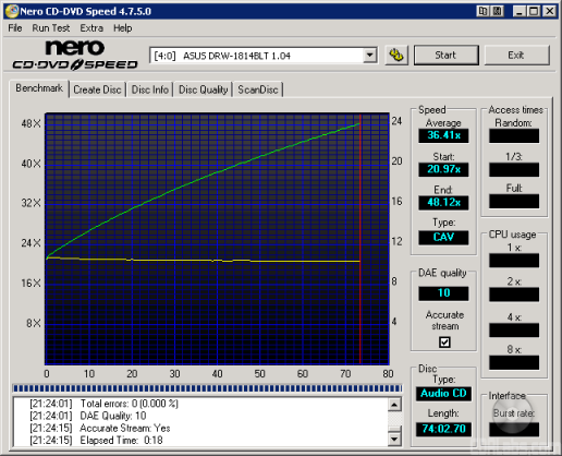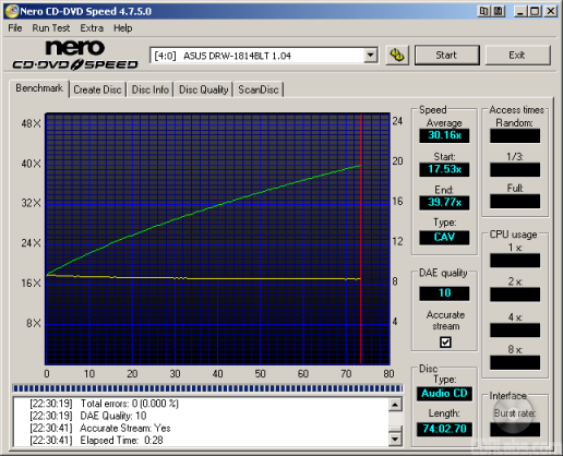 ASUS's new DVD writer performed very well in our CD Winbench tests. In the transfer rate tests, the DRW-1814BLT started reading at 21.6x (3240 / 150) on the inside and reached a maximum speed of about 43.1x (6470 / 150) on the outside. This resulted in a very good overall CD Winbench score.