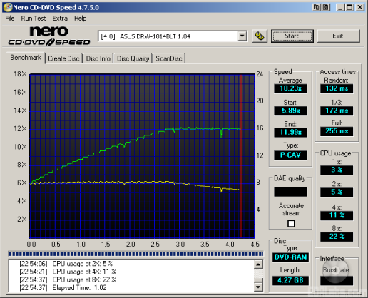 The DRW-1814BLT is the first drive to feature 14x DVD-RAM writing speeds. As you can see, it uses CAV to reach this speed.
