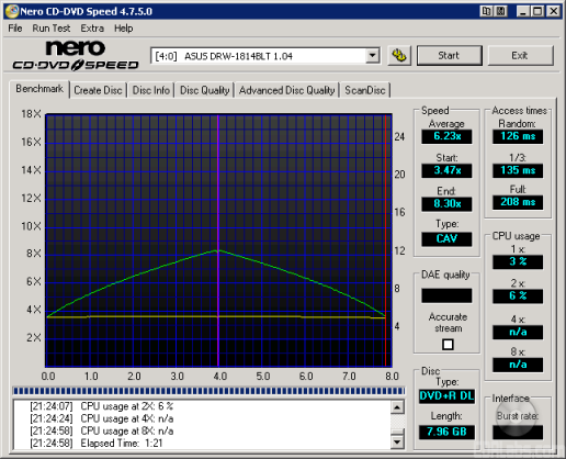 The DRW-1814BLT didn't slow down very much when reading single layer DVD videos. It started out at about 6.63x and reached a maximum read speed of 16.08x. ASUS's new drive was also fairly quick when reading dual layer discs. By looking at the screenshot below, you can see that the drive's transfer speeds peaked at about 8.25x.