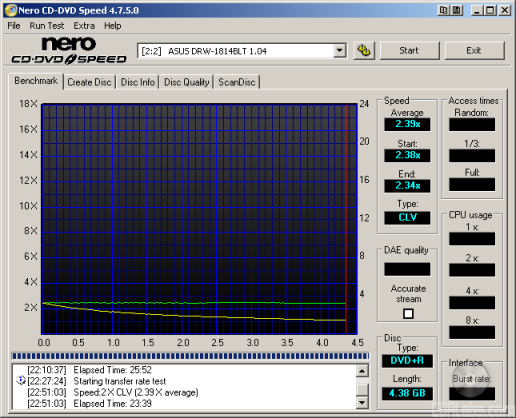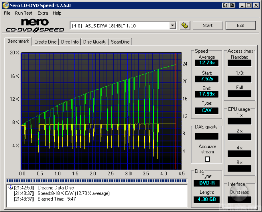 When writing to DVD+R and DVD-R media at 18x, the DRW-1814BLT uses CAV. By looking at the screenshots above, you can see that ASUS's new drive starts writing at about 7.5x and accelerates, reaching its maximum speed at the end of the disc.