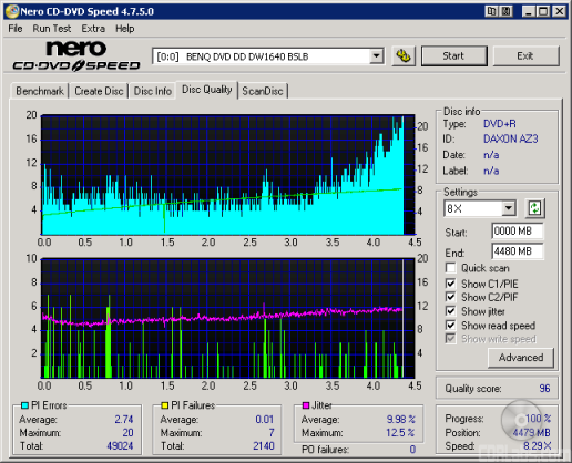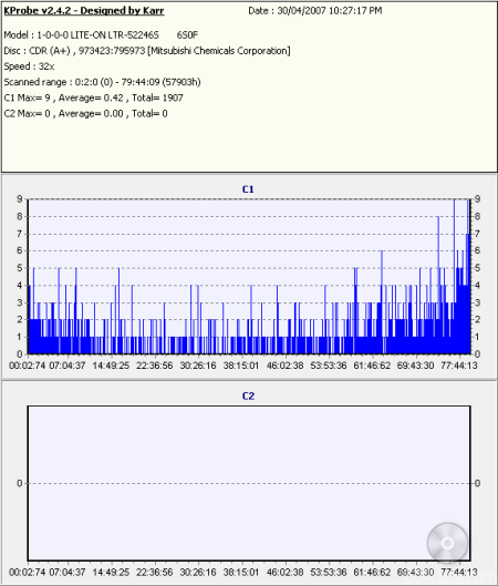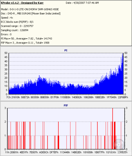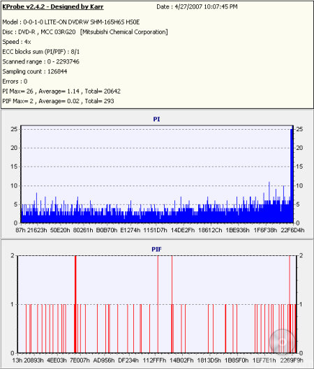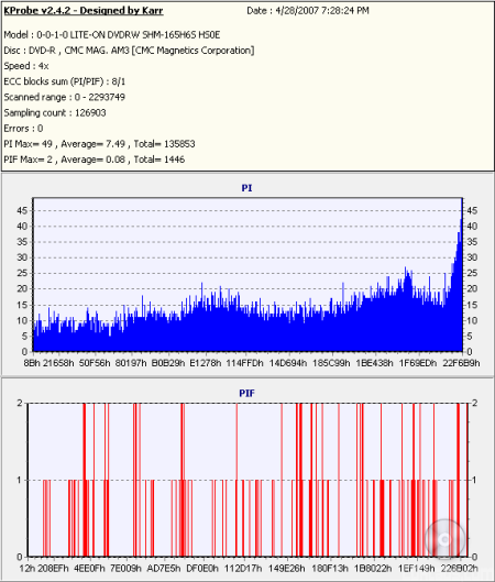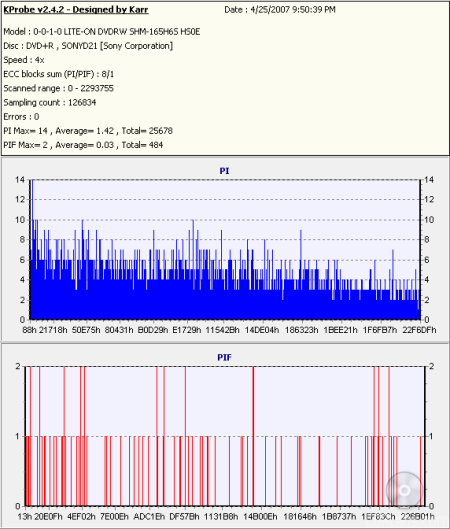 So what are "good" results supposed to look like? With KProbe, the PI errors should not exceed 280 and the number of PIF errors should stay below 4. When testing with CD Speed, the number of PI errors should stay below 280 as well. However, because it scans with an ECC sum of 8, a higher number of PIF errors is acceptable, as long as they do not exceed 32. Since POF errors are uncorrectable, we really don't want to see any of them at all.
