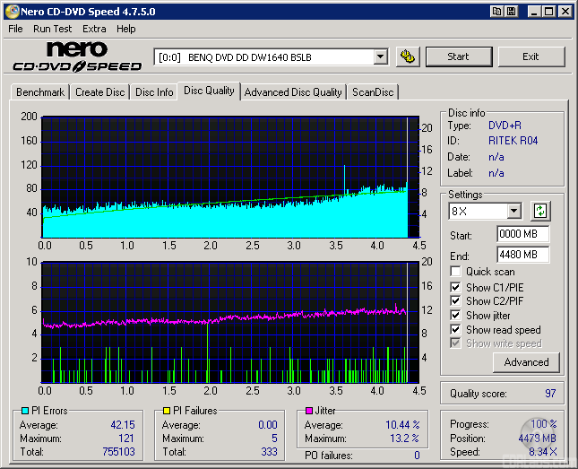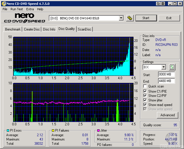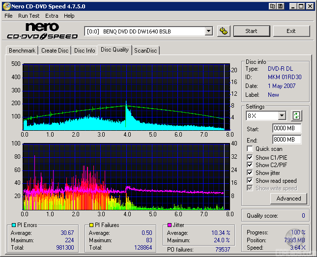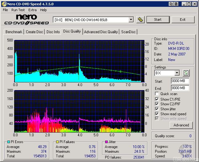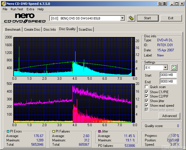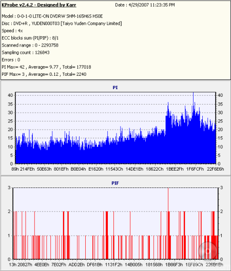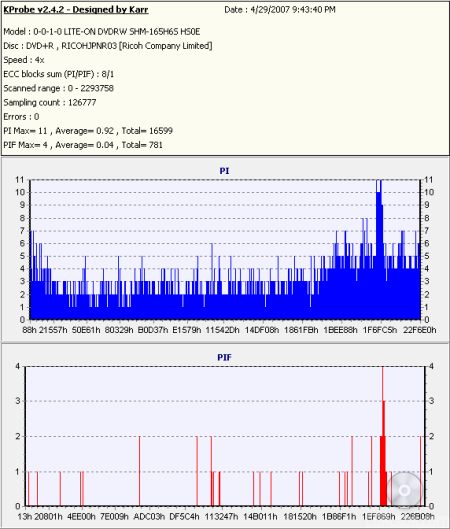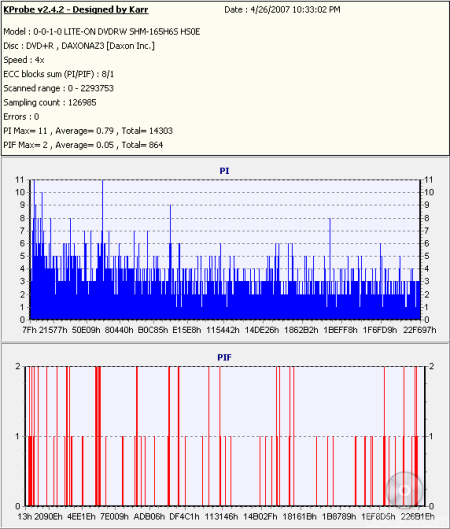So what about writing quality? Testing a drive's DVD writing quality isn't easy. Until now, there were very few options, unless you wanted to shell out thousands of dollars for a certified test machine. Thanks to KProbe, we can test a disc's PI (Parity Inner) and PIF (Parity Inner Fail) rates.For these tests I used a Lite-On SHM-165H6S (firmware HS0E) and read the discs at 4x with the PI and PIF ECC sums set to 8 and 1 respectively. For comparison, I also tested the discs on a BenQ DW1640 (firmware BSLB). When combined with Nero CD Speed, the DW1640 is able to report PI Errors, PI Failures, Parity Outer Failures and even jitter levels. For this test, the discs are read at 8x with both the PI and PIF ECC sums set to 8.
