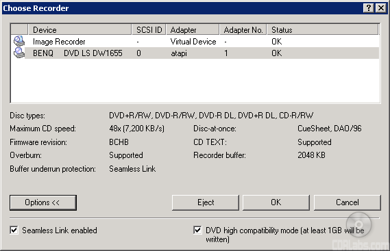 The Nero screenshot also shows that the DW1655 has a maximum CD writing speed of 48x and a 2048KB buffer. This buffer is backed up by BenQ's Power-Burn buffer underrun protection. According to Nero, the DW1655 can write CD-Text and overburn. When testing the drive's capacity, it had no problems overburning up to 99 minutes with our CompUSA media.