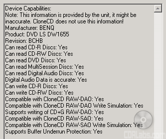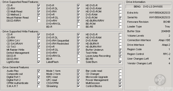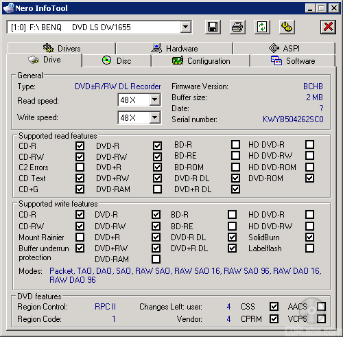 InfoTool also shows that the DW1655 is an RPC-2 DVD drive. This means that the drive's region is stored in the firmware. The drive's region can be changed five times and after that it cannot be changed anymore. A patched RPC-1 firmware can be downloaded here. Just keep in mind that it is not supported by BenQ nor by CDRLabs. Use it at your own risk.