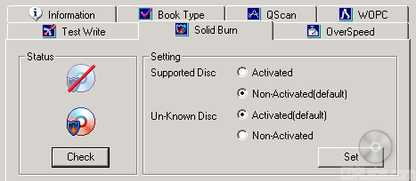 SolidBurn also works with supported media. When activated, the drive will ignore the writing strategy stored in the firmware and instead create a new one. This is very useful if you are trying to record a disc that uses another company's MID code (I.E. fake TYG02 code discs).