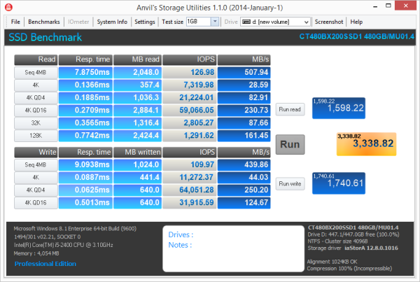 Anvil's Storage Utilities is another new benchmark designed with SSDs in mind. The standard storage benchmark measures a drive's performance by testing its transfer speeds, access times and IOPS.