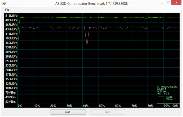 As I mentioned earlier, the BX200 is based on Silicon Motion's SM2256 controller chip. Looking at the screenshot above, you can see that it performs equally well with both incompressible (0%) and compressible (100%) data.