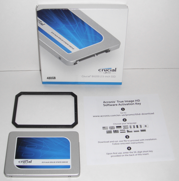 The BX100 comes in a small, white box. While there aren't a lot of technical details, the packaging provides basic information like the drive's capacity and a list of the box's contents. Inside, you'll find the SSD, a mounting spacer for use with traditional 9.5mm drive bays, and a small piece of paper with a software activation key for Acronis True Image HD. If you're looking for an install guide or warranty information, you will need to visit Crucial's support website.