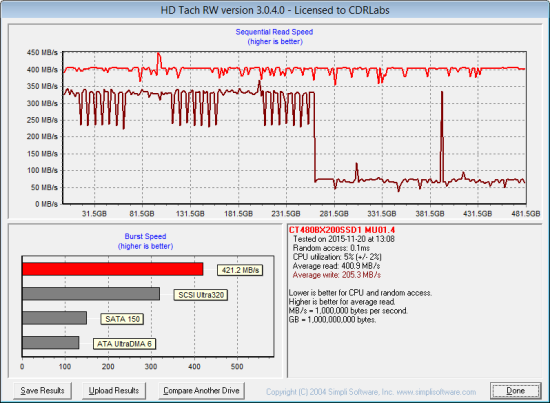 Lastly, I used Crucial's Storage Executive software to perform a secure erase (aka sanitize) on the BX200. With the drive wiped clean, it had average read and write speeds of 400.9 MB/s and 205.3 MB/s, respectively.