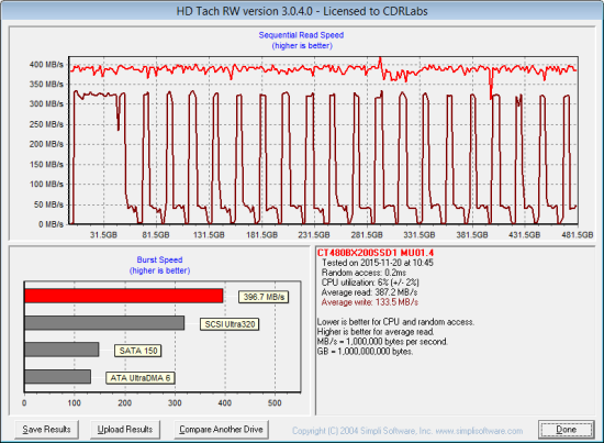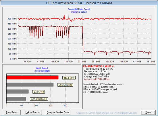 Next, I used HD Tach to test the BX200's read, write and burst speeds as well as its seek times and CPU usage.