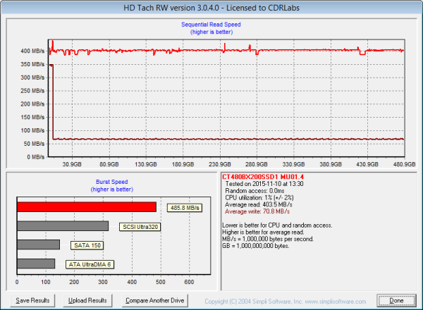 Looking at the screenshot above, you can see that the BX200 had average read and write speeds of 403.5 MB/s and 70.8 MB/s respectively, as well as a burst speed of 485.8 MB/s. The screenshot also shows that, like most other TLC-based SSDs, the BX200 uses some sort of SLC caching. The drive starts writing at about 350 MB/s and then drops to about 70 MB/s when the write operation exceeds the size of the cache.
