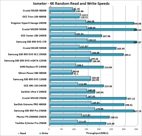 Lastly, I ran a series of tests using Iometer. This tool can be configured to benchmark a number of things. In this case, I used it to measure the BX200's read and write speeds and the number of operations per second. The tests were run using random bytes and a queue depth of 3.