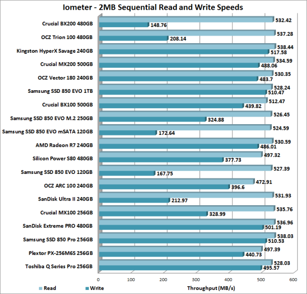 The BX200's performance was hit and miss when tested with Iometer. While the drive was able to read at a respectable 532.42 MB/s, its sequential write speed averaged out at only 148.76 MB/s.