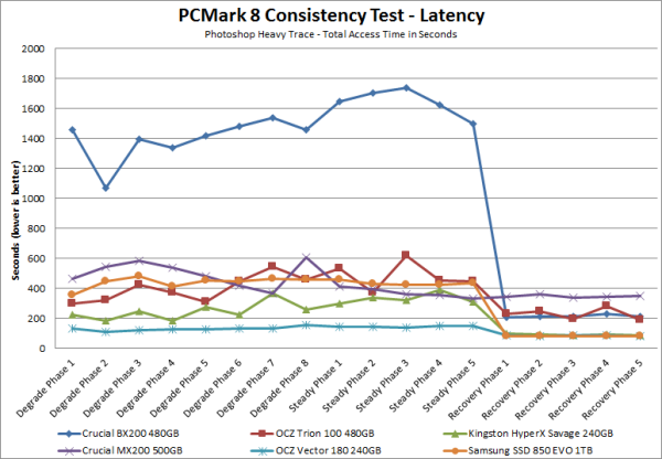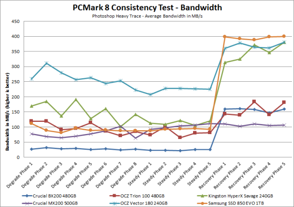 PCMark 8 also includes a consistency test which measures the performance consistency and degradation tendency of a storage system. The test reports the performance level at the start, the degraded steady-state and the recovered state as well as the number of iterations required to reach them. For this test, we are focusing on the Adobe Photoshop (Heavy) trace and will look at both the bandwidth and latency of the drive