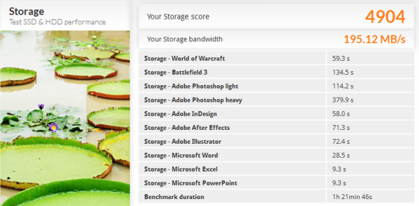 PCMark 8 is a complete benchmark for Windows. It includes five benchmark tests, each designed around a specific scenario. The storage benchmark measures drive performance using real-world traces recorded from Adobe Creative Suite, Microsoft Office and a selection of popular games.