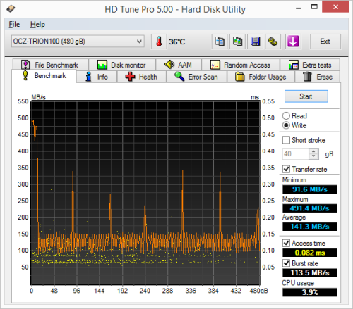 The BX200 performed relatively well when benchmarked with HD Tune. The drive had average read and write speeds of 497.7 MB/s and 93.2 MB/s, respectively, and a burst rate of 112.3 MB/s when reading.
