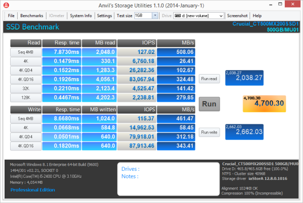 Anvil's Storage Utilities is another new benchmark designed with SSDs in mind. The standard storage benchmark measures a drive's performance by testing its transfer speeds, access times and IOPS.