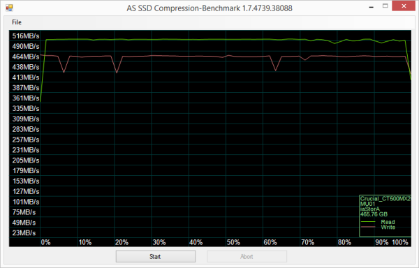 As I mentioned earlier, the MX200 is based on Marvel's 88SS9189 controller chip. Looking at the screenshot above, you can see that it performs equally well with both incompressible (0%) and compressible (100%) data.