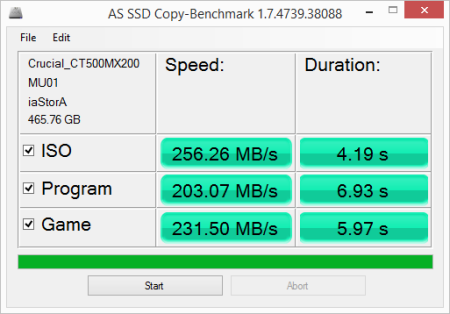 AS SSD also includes a copy benchmark. This test copies an ISO (two large files), program (many small files) and game (small and large files), returning the speed and duration of each.