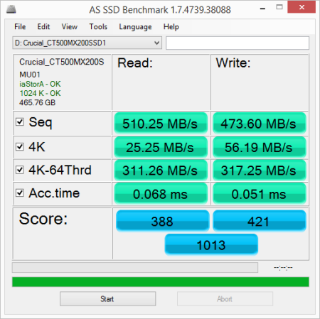 Lastly, I used Parted Magic to perform a secure erase on the MX200. With the drive wiped clean, it had average read and write speeds of 507.05 MB/s and 475.74 MB/s, respectively.