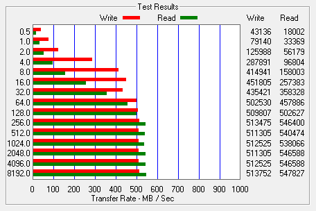 When tested with ATTO, the MX200's read speeds topped out at about 547 MB/s and its write speeds at 513 MB/s.