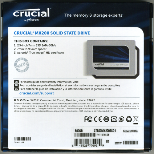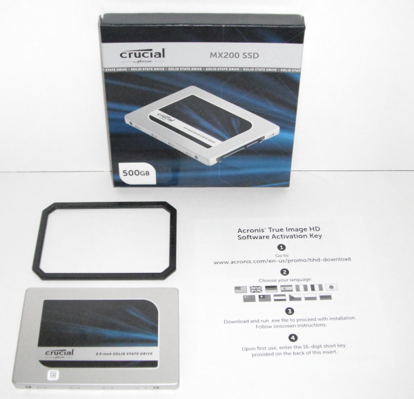 The MX200 comes in a small, blue box. While there aren't a lot of technical details, the front and back of the box show the drive from a few different angles and provide information like the capacity and a list of the box's contents. Inside, you'll find the SSD, a mounting spacer for use with traditional 9.5mm drive bays, and a small piece of paper with a software activation key for Acronis True Image HD. If you're looking for an install guide or warranty information, you will need to visit Crucial's support website.
