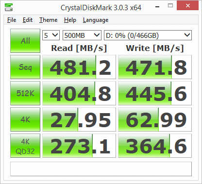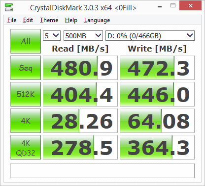 The MX200 performed equally well when using highly compressible 0x00 (0 Fill) data. This time around, the drive was able to read at 480.9 MB/s and write at 472.3 MB/s.