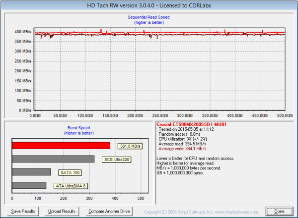 Looking at the screenshot above, you can see that the MX200 had average read and write speeds of 394.5 MB/s and 384.1 MB/s respectively, as well as a burst speed of 381.0 MB/s.