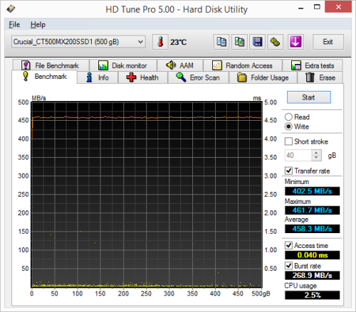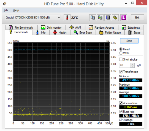 The MX200 performed fairly well when benchmarked with HD Tune. The drive had average read and write speeds of 500.5 MB/s and 458.3 MB/s, respectively, and a burst rate of 268.9 MB/s when writing.