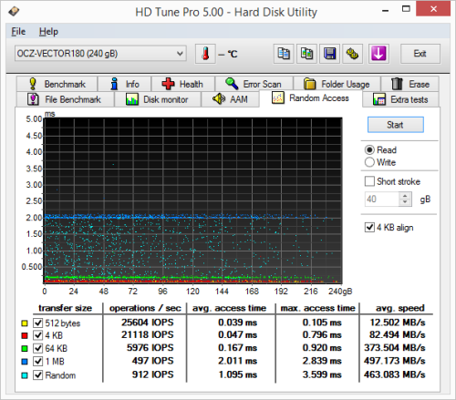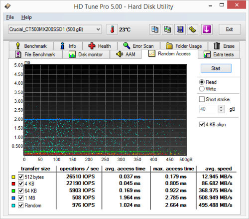 Next, I ran a series of tests using HD Tune Pro. This hard disk utility measures a drive's performance by testing its sequential read and write speeds as well as its access time, burst rate and CPU usage. For this review, I'm also going to use it to benchmark the MX200's random read and write speeds, random access times and the number of operations per second.