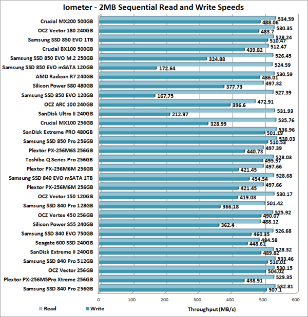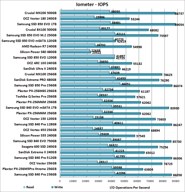 To test the performance of the Crucial MX200, I ran a series of benchmarks using CrystalDiskMark 3.0.1, HD Tach RW 3.0.4.0, ATTO Disk Benchmark 2.46, AS SSD, HD Tune Pro 5.00, Anvil's Storage Utilities and Iometer. For comparison, I've also included test results from the OCZ Vector 180, Crucial BX100, Samsung 850 EVO M.2, Samsung 850 EVO mSATA, AMD Radeon R7, Silicon Power Slim S80, Samsung SSD 850 EVO, OCZ ARC 100, SanDisk Ultra II, Crucial MX100, SanDisk Extreme Pro, Samsung SSD 850 PRO, Plextor PX-256M6S, Toshiba Q Series Pro, Plextor PX-256M6M, Samsung SSD 840 EVO mSATA, OCZ Vector 150, OCZ Vertex 450, Silicon Power Slim S55, Samsung SSD 840 EVO, Seagate 600 SSD, SanDisk Extreme II, OCZ Vector, Plextor PX-256M5Pro Xtreme, and Samsung SSD 840 Pro.